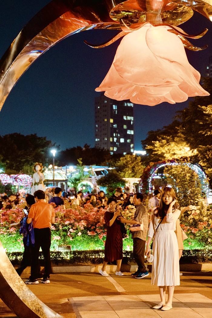 ☞ 25일(토) 저녁 서울장미축제를 찾은 연인이 야간 조명이 켜진 수림대 장미정원에서 장미꽃을 배경으로 사진을 찍고 있다.