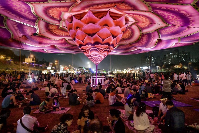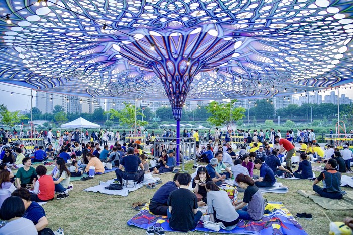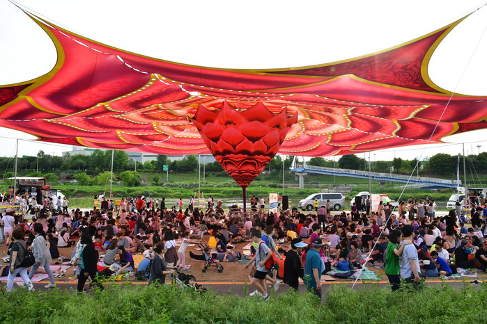 ☞ 25일(토) 서울장미축제를 찾은 방문객들이 중랑천 둔치에 설치된 대형 아트그늘막 아래 잔디밭에 돗자리를 깔고 시원한 강바람에 더위를 식히며 가족, 연인, 친구들과 함께 둘러앉아 피크닉을 즐기고 있다.