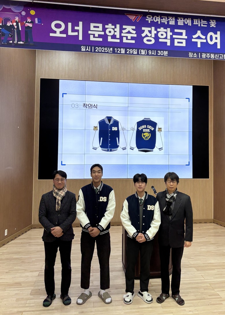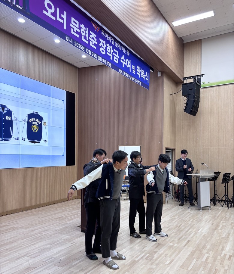 [사진 1,2] 광주동신고등학교가 9일 학교 시청각실에서 ‘오너 문현준 장학금 수여 및 착복식’을 개최했다. /광주시교육청 제공