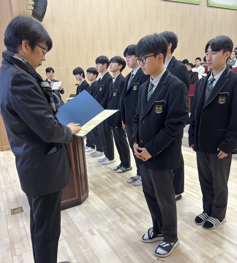 [사진 3] 광주동신고 한래진 교장이 9일 학교 시청각실에서 ‘오너 문현준 장학금’ 장학생으로 선정된 1~2학년 학생들에게 장학증서를 전달하고 있다. /광주시교육청 제공