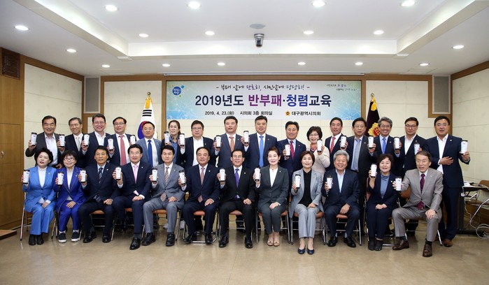 [대구=세계타임즈 한성국 기자] 대구광역시의회(의장 배지숙)는 4월 23일(화) 오후 3시 30분부터 시의회 3층 회의실에서 대구시의원 및 의회사무처 공무원 50명을 대상으로 반부패 청렴 교육을 실시하였고, 교육 중간에는 청렴텀블러를 만들어 ‘부패 앞에 단호히, 시민 앞에 당당히’ 구호를 외치며 청렴실천 퍼포먼스를 펼치기도 했다.