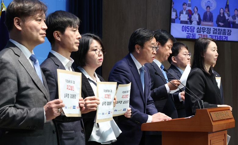 더불어민주당 이용우 의원을 비롯한 야5당 의원들이 10일 서울 여의도 국회 소통관에서 심우정 검찰총장 공동 고발 회견을 하고 있다. 2025.3.10