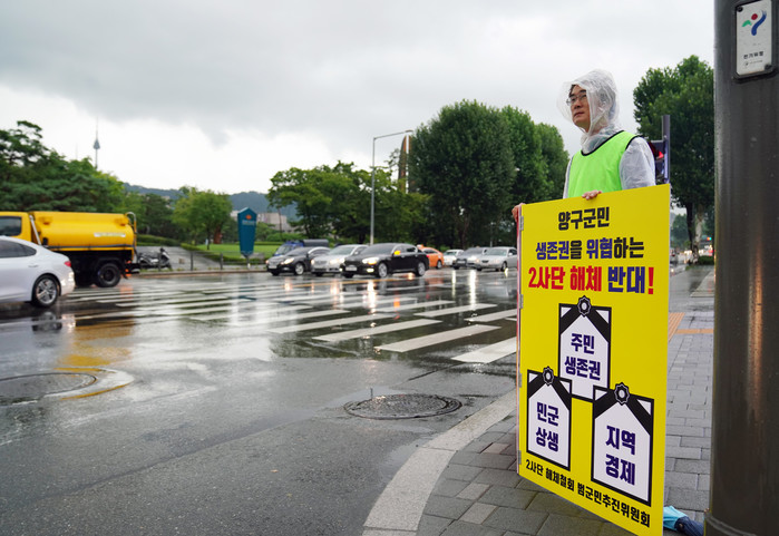[양구군=세계타임즈 김민석 기자] 신철우의원이 31일 서울 용산 국방부 정문에서 2사단 해체반대 1인시위를 하고있다.