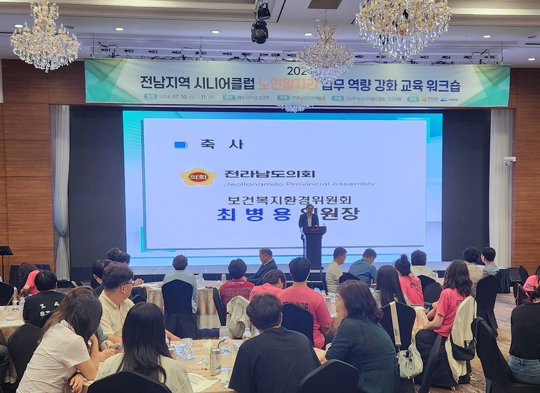 [전남 세계타임즈=우덕현 기자] 전라남도의회 최병용 보건복지환경위원장(더불어민주당, 여수5)은 지난 7월 10일 여수디오션리조트에서 열린 ‘2024년 전남지역 시니어클럽 노인일자리 업무 역량 강화 교육’ 위크샵에 참석해 행사 개최를 축하하고 관계자들의 노고를 격려했다.