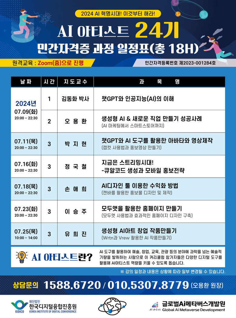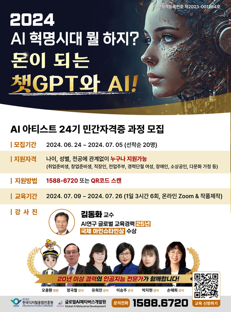 [세계타임즈]최성룡기자 = 한국디지털융합진흥원 부설 글로벌 AI 메타버스 개발원(원장 오용환)은 오는 7월 10일부터 26일까지 생성형 AI를 활용한 비즈니스 모델을 만들기 위해 마련된 'AI 아티스트 전문가 양성과정' 24기를 모집한다.