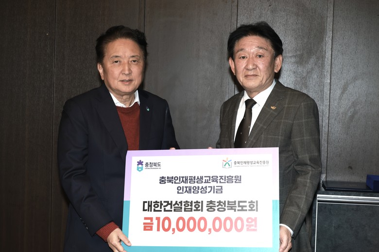 기탁식에는 김영환 충북도지사, 유정선 대한건설협회 충북도회장을 비롯한 건설업계 관계자 등이 참석했으며, 전달된 장학금은 충북인재평생교육진흥원을 통해 도내 학생들의 학업 장려 및 교육 지원 사업에 사용될 예정이다.