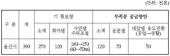 정부의 「2025 수도정비기본계획」에 따르면 울산시 청정원수 필요량은 2025년 기준 1일 39만톤으로 부족량은 12만톤입니다. 아래 도표와 같이 부족분 공급방안으로는 경북지역 운문댐 용수 7만톤과 대암댐 용도전환(공업용수→생활용수)으로 5만톤을 확보하도록 계획 되어 있습니다.