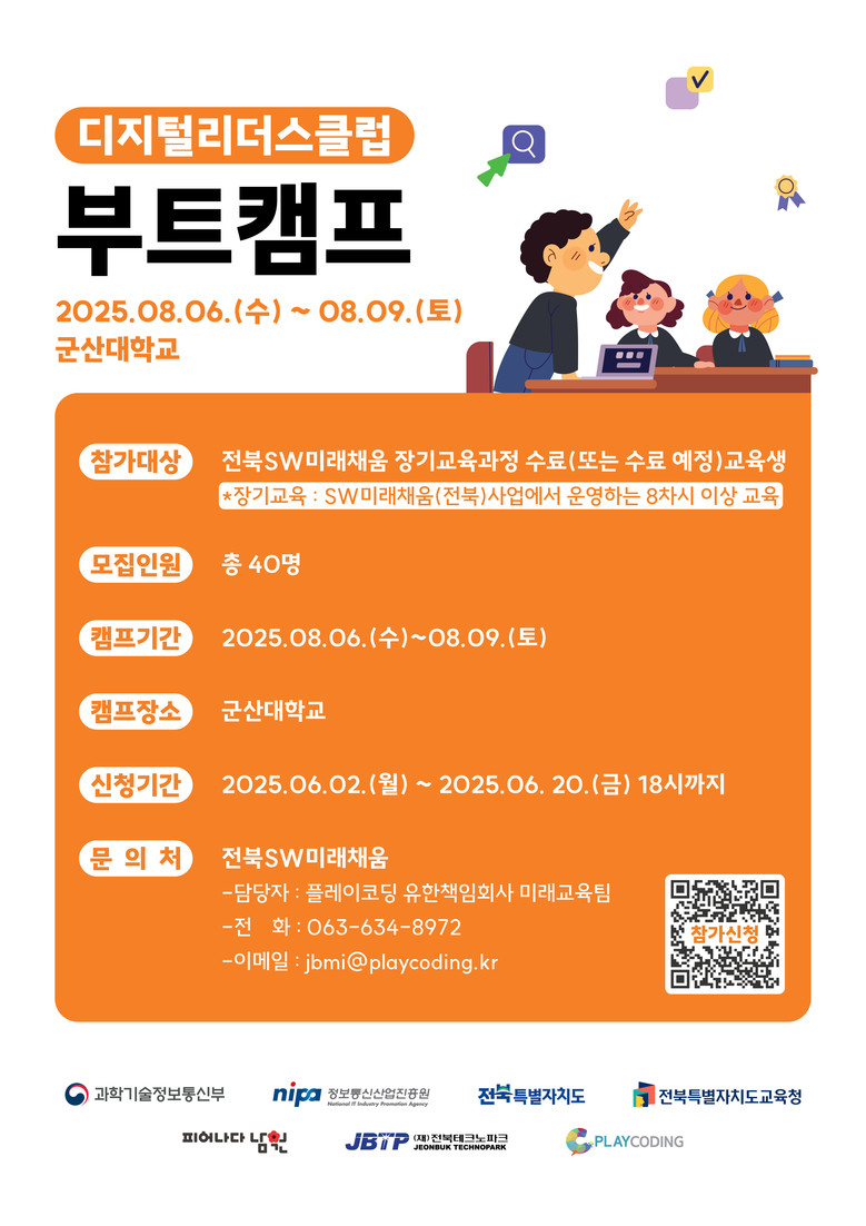 ‘디지털리더스클럽’은 SW개발에 소질과 흥미가 있는 초‧중등 학생을 대상으로 SW/IT분야 엘리트 교육을 진행하는 남원시 지역특화 프로그램이다. 디지털리더스클럽의 부트캠프는 8월 6일부터 8월 9일까지 군산대학교에서 진행될 예정이고, SW장기교육과정(8차시)이상을 이수(또는 이수 예정인) 40명의 학생들을 대상으로 SW‧AI 교육과 다양한 체험 활동을 제공해 디지털 실전 역량 강화 및 진로 설정에 실질적인 도움을 주기 위해 마련됐다.