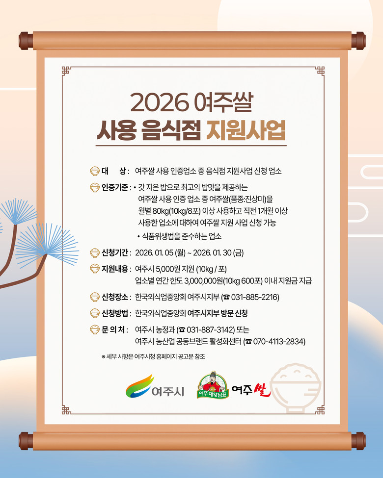 신청 기간은 2026년 1월 5일(월)부터 1월 30일(금)까지이며, 지원 내용은 여주쌀 10kg당 5,000원 지원이며 음식점 한 곳당 연간 최대 300만 원까지 지원받을 수 있다.