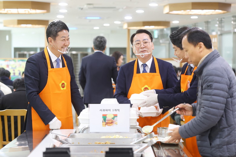 오찬에는 떡국과 돼지불고기, 오징어미나리초무침, 샐러드 등이 나왔으며, 김 의장은 임채호 의회사무처장, 박호순 의정국장과 함께 직접 사과파이를 직원들에게 일일이 배식하며 격려했다.