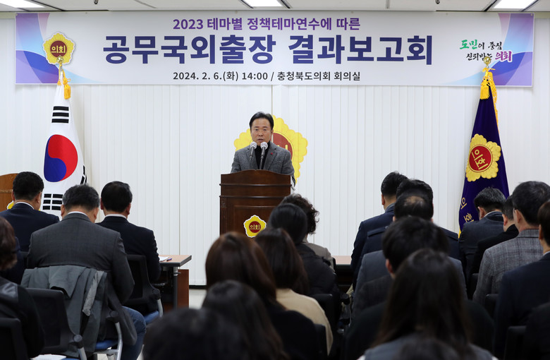 [충북 세계타임즈=이현진 기자] 충북도의회(의장 황영호)는 6일 도의회 회의실에서 2023년 정책테마연수 공무국외출장 결과보고회를 개최하고 연수 사례를 공유했다.