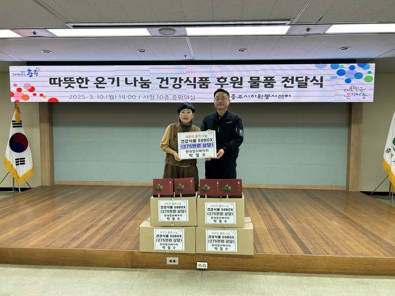 ○ 대 상 : 건강식품 50개 후원 (275만원 상당) [세계타임즈=충주시 이현진 기자] 현대엘리베이터 박철수 씨(56세)는 충주시 지역 내 따뜻한 온기 나눔 문화를 실천하기 위해 10일 충주시청 10층 중회의실에서 건강식품 50개(275만원 상당)를 충주시자원봉사센터(센터장 심영자)에 전달했다.