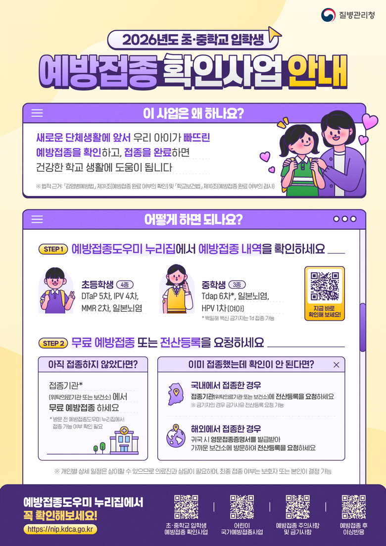 2026년 초·중학교 입학생 보호자는 자녀의 예방접종 내역을 확인*하고, 미접종 시 가까운 보건소나 위탁의료기관에서 무료로 접종 받을 수 있다.