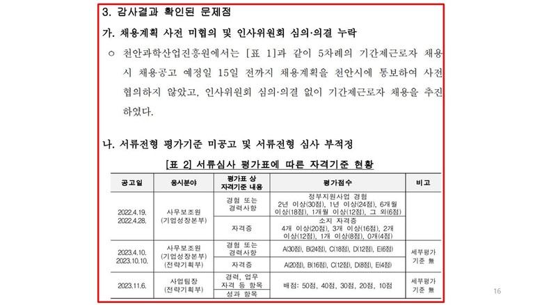 특히, 천안시민프로축구단은 전 사무국장의 퇴직 공무원 재취업 논란과 셀프채용* 사건이 있었고, 과진원은 시청 공무원이 파견돼있던 22년부터 2년간 채용 절차 문제**가 5건 있었다고 밝히며, 이를 제대로 관리·감독하지 않고 방치한 시의 책임이 크다고 지적했다.