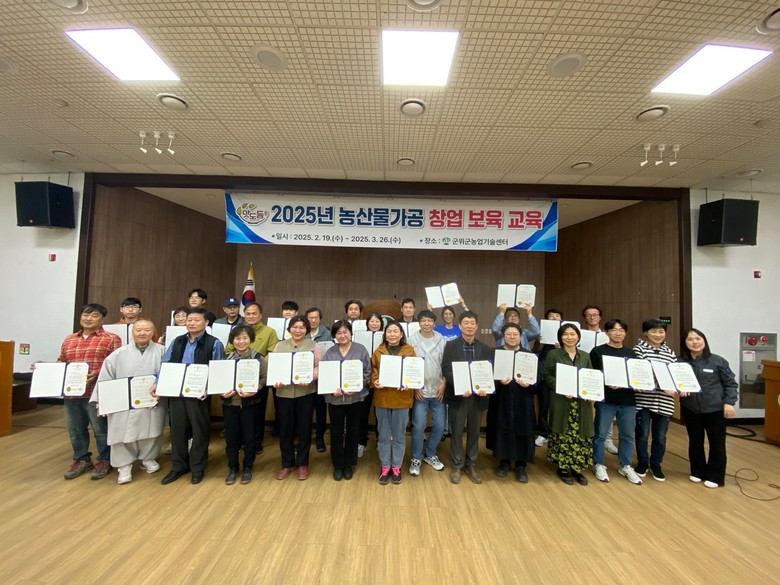 [군위군 세계타임즈=한윤석 기자] 군위군 농산물공동가공센터는 최근 농산물 가공에 관심 있는 지역 농가를 대상으로 ‘농산물가공 창업보육교육’1기 과정을 성공적으로 마쳤다. 이번 교육은 농산물가공을 통한 부가가치 창출과 농가 소득 증대를 목표로 지난 2월 19일부터 3월 26일까지 매주 수요일 4시간씩 총 6회로 진행되었다.