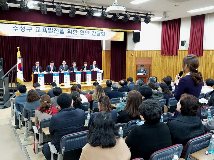 [대구=세계타임즈 한성국 기자] 대구광역시의회 교육위원회는 11월 22일 오후 3시 대구수성초등학교 시청각실에서 수성구 지역 26개교 학교장, 학교 운영위원 및 학부모 등을 초청해 현장의 목소리를 청취하고 교육현안 문제 해결 및 의정활동 반영을 위한 간담회를 개최하였다.