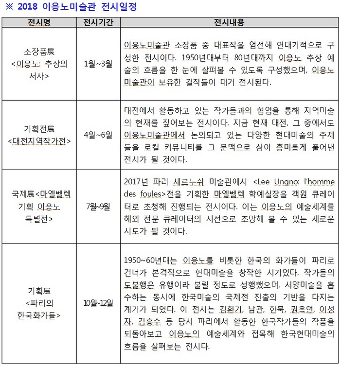 ○ 2018년을 여는 첫 전시인 <2018 이응노미술관 소장품 하이라이트 전 – 이응노 : 추상의 서사>는 이응노미술관 소장품 중 대표작을 엄선해 연대기적으로 구성한 전시이다. 1950년대부터 80년대까지 이응노 추상 예술의 흐름을 한 눈에 살펴볼 수 있도록 구성했으며, 이응노미술관이 보유한 걸작들이 대거 전시된다.