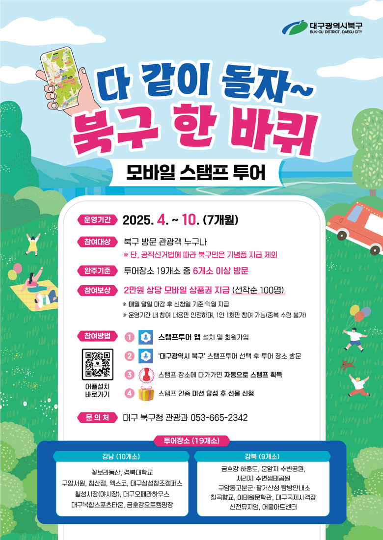 이번 「다 같이 돌자~ 북구 한 바퀴」 모바일 스탬프 투어는 북구 관광지 19개소를 대상으로 꽃보라동산 등 벚꽃놀이 한 바퀴, 구암동 고분군 등 역사 탐방 두 바퀴, 대구국제사격장 등 신나는 체험 세 바퀴, 금호강 바람소리길 축제 등 가을축제 네 바퀴로 추천코스를 구성하여 북구 곳곳 숨은 명소를 즐길 수 있도록 구성하였다.