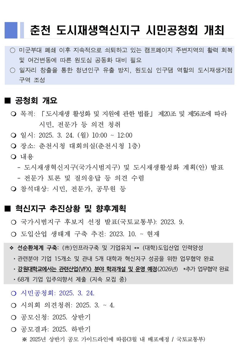 춘천시에 따르면 3월 24일 오전 10시 춘천시청 1층 대회의실에서 춘천 도시재생혁신지구 시민공청회가 열린다.