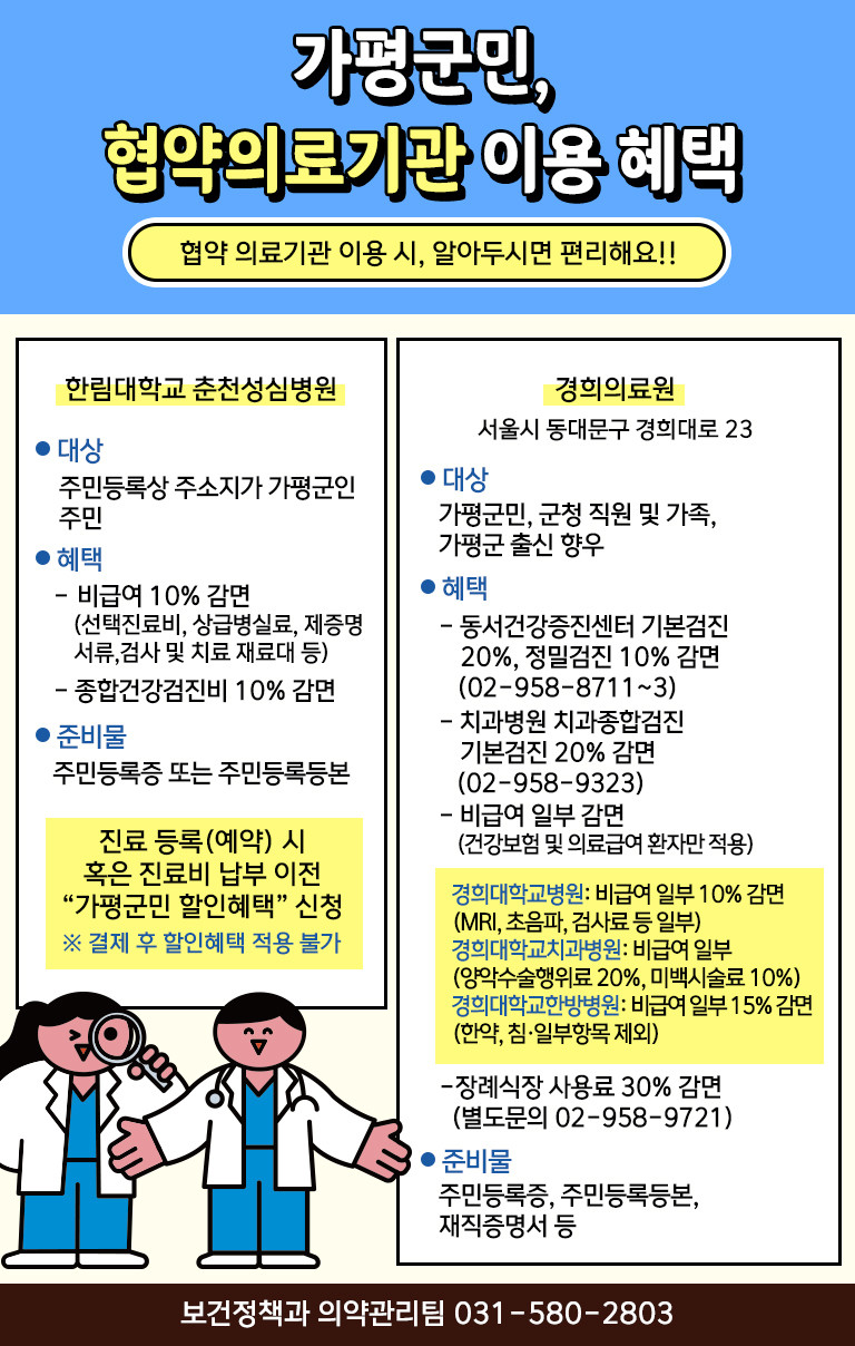 가평군은 대형 의료기관 이용 부담을 줄이기 위한 협약 의료서비스도 시행하고 있다. 한림대학교 춘천성심병원, 경희의료원 2곳과 협약을 맺어 군민이 해당 병원을 이용할 경우 비급여 진료비 등을 감면받도록 했다. 다만 협약 의료기관 감면 혜택은 예약 단계 또는 진료비 납부 이전에 신청한 경우에만 적용된다. 이미 결제가 완료된 건에 대해서는 소급 적용이 되지 않아 주의가 필요하다. 협약 의료기관을 이용해 감면 혜택을 받은 군민이 연간 4,000여 명에 달할 정도로 좋은 반응을 얻고 있다.