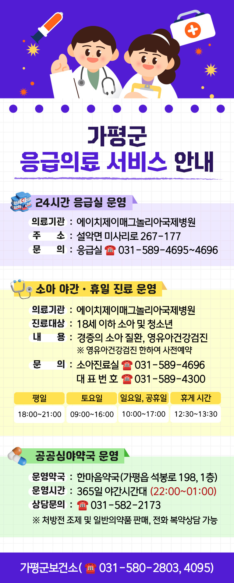 가평군 관계자는 “취약시간대 응급실, 심야약국 운영과 협약병원 감면 제도는 군민 실생활과 직결된 의료 안전망이다”며 “사전에 의료 안전망 서비스를 잘 파악해 야간이나 응급 상황에서 관련 의료서비스를 적극 이용해 달라”고 말했다.