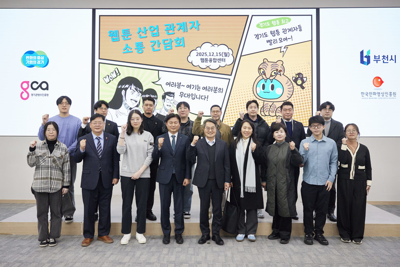 이날 간담회는 웹툰 산업 종사자 청년 및 기업 대표 등 산업 관계자, 조용익 부천시장, 부천시 지역의 도의원 등 17명이 참석했다. 특히 산업 관계자 10명은 2025년 경기도의 ‘웹툰 청년 인턴십’ 사업을 통해 대학생 인턴십을 경험 후 해당 웹툰 기업에 취업한 청년인재 5명과 참여기업 관계자 5명으로 구성됐다.