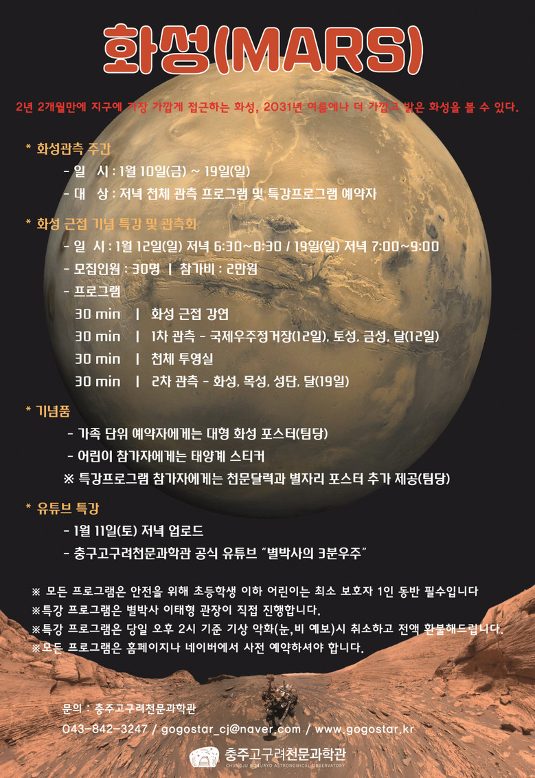 또한 1월 12일(일)과 19일 저녁에는 2시간 동안 별박사 이태형 관장이 직접 진행하는 ‘화성 근접 기념 특강 및 관측회’를 실시할 예정이다. 이날 특별 관측회에는 화성 이외에도 올해 첫 가장 밝은 모습으로 나타나는 국제우주정거장(12일 저녁, -3.6등급)을 함께 볼 수 있으며, 금성과 목성, 토성, 달도 관측할 수 있다. 특강에서는 지구와 가장 닮은 화성의 과거와 미래에 대해 재미있는 강연도 준비되어 있다. ‘화성 근접 기념 특강 및 관측회’에 참여하기 위해서는 충주고구려천문과학관 홈페이지에서 사전에 신청해야 한다.