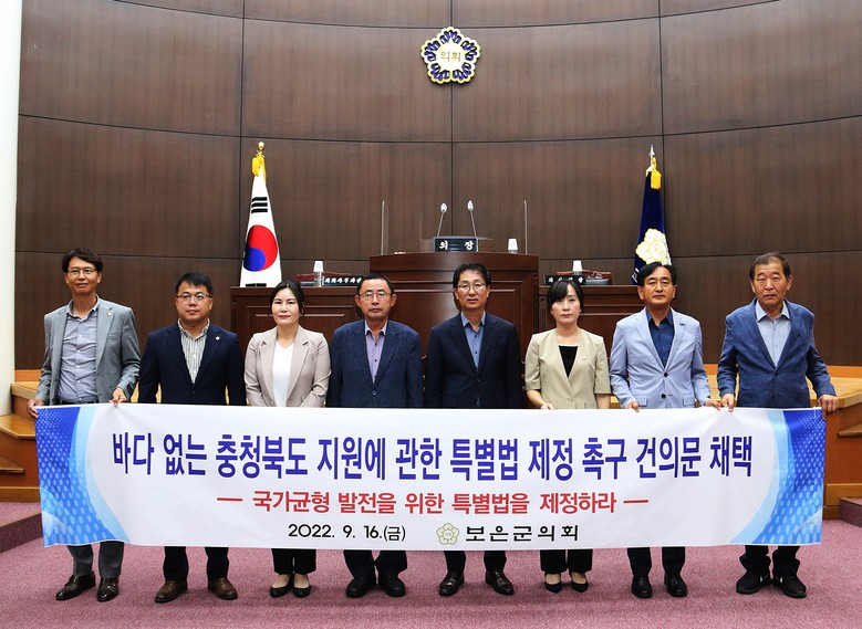 [보은군 세계타임즈=이현진 기자] 보은군의회(최부림 의장)는 9월 16일(금) 제372회 보은군의회 제1차 정례회 제2차 본회의에서 의원 공동발의로 ‘바다 없는 충청북도 지원에 관한 특별법’ 제정을 촉구하는 건의문을 채택했다.