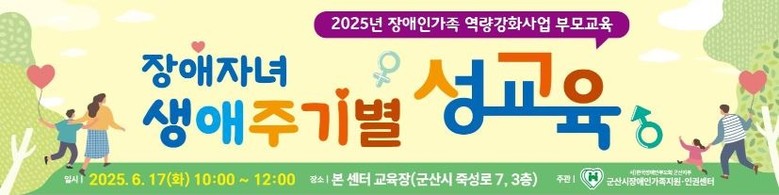 이번 ‘장애자녀 생애주기별 성교육’은 2025년 6월 17일 오전 10시부터 두 시간 동안 군산시장애인가족지원인권센터 교육장에서 무료로 진행된다.