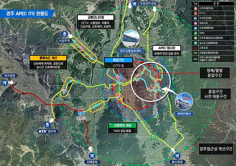 | ▲ 경주시가 APEC 정상회의를 대비해 보문관광단지 일원에 자율주행 기반의 스마트 신호제어, 감응신호, CCTV 등 첨단 교통 인프라를 구축 중인 ITS 사업 현황도. |