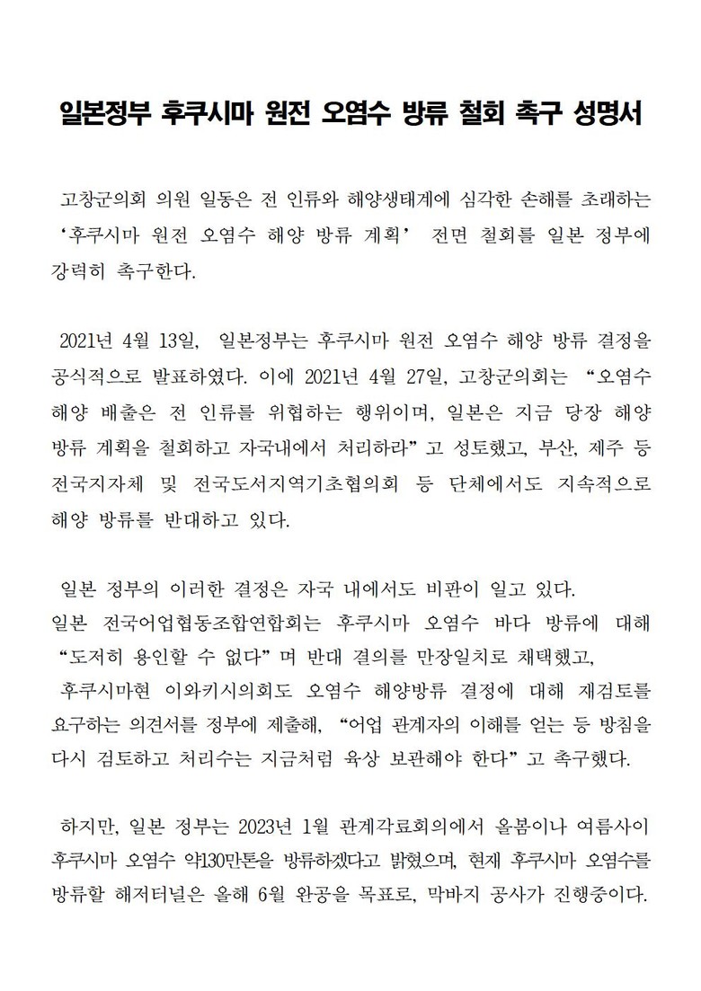 고창군의회는 이번 성명서를 통해서 △일본 정부는 국제사회 및 인접 국가의 동의 없는 오염수 방류 계획 전면 철회할 것, △일본 정부는 국제사회의 일원으로서 후쿠시마 원전 오염수 처리에 대한 모든 정보를 대한민국 정부와 국제사회에 투명하게 공개할 것, △대한민국 정부는 국제사회와 공조를 강화하여 일본 정부의 후쿠시마 원전 오염수 해양 방류 저지를 위해 국제법적 대응에 나설 것 등을 촉구했다.