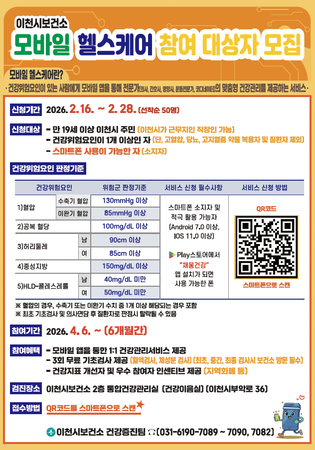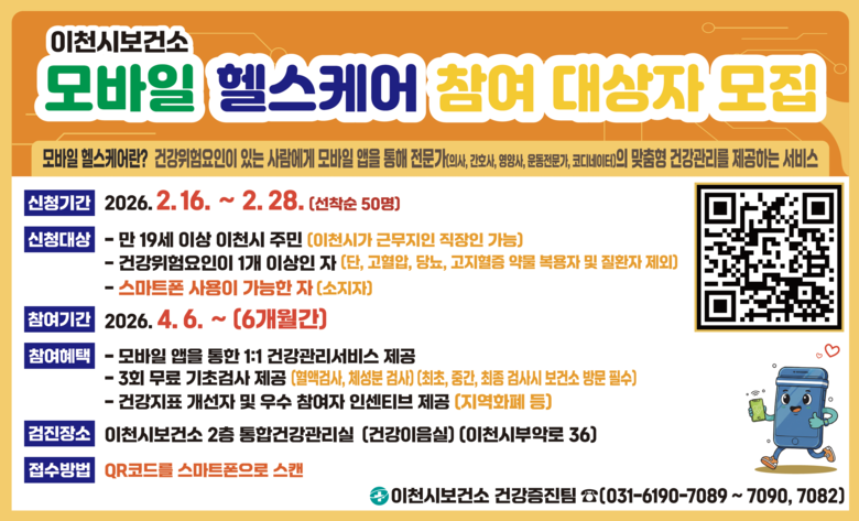 이천시보건소 관계자는 “모바일 헬스케어는 바쁜 현대인들이 일상에서 스스로 건강을 관리할 수 있는 최적의 서비스”라며, “만성질환 예방을 통해 시민들의 삶의 질이 향상되기를 기대하며 적극적인 참여를 바란다”라고 전했다.
