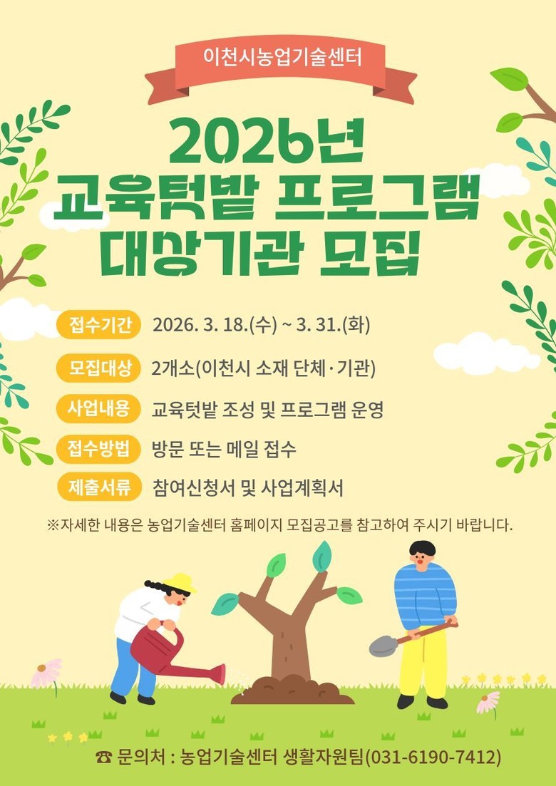 신청을 원하는 기관은 이천시농업기술센터 누리집에서 신청서를 내려받을 수 있으며, 구비서류를 갖춰 3월 31일까지 농업기술센터 농업진흥과를 방문하거나 전자메일로 제출하면 된다.