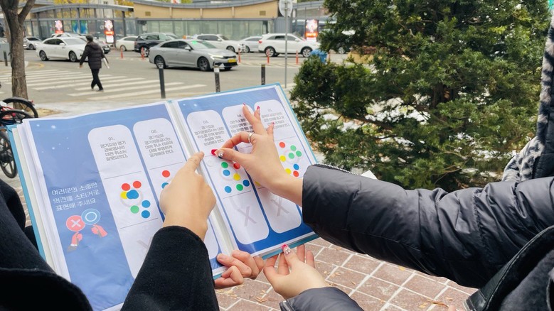 | ▲5일 신천지 바돌로매지파 홍보팀이 ‘편파적인 종교탄압’ 규탄 시민 동의 활동을 진행하는 가운데 시민이 동의 스티커를 붙이고 있다 [사진 제공 = 신천지 바돌로매지파] |