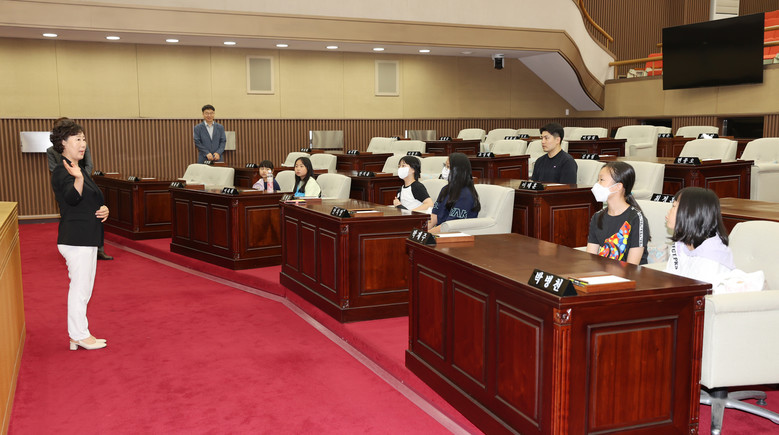 [충북 세계타임즈=이현진 기자] 보은군 수한초등학교 교사와 학생들이 14일 충북도의회 본회의장을 방문해 박경숙 의원(보은)으로부터 의회의 기능과 역할 등에 대한 설명을 들었다.