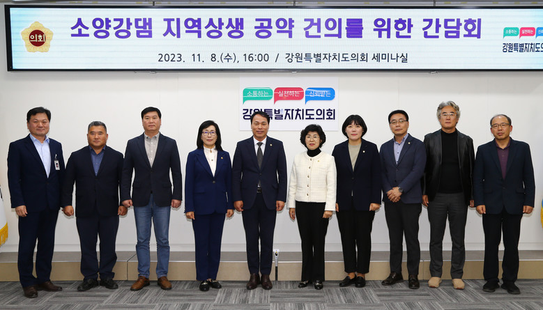 [강원도 세계타임즈=김민석 기자] 소양강댐 피해지역 공동대책위원회(박기영 위원장,엄윤순 부위원장)는 11월 8일 수요일 오후4시 강원특별자치도의회 세미나실에서「소양강댐 지역상생 공약 건의를 위한 간담회」를 개최한다고 알려왔다.