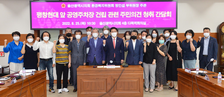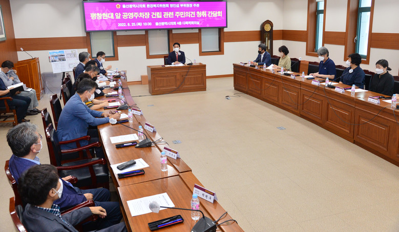 [울산 세계타임즈=이호근 기자] 울산광역시의회 방인섭 의원(환경복지위원회 부위원장)은 25일 오전 10시 30분, 시의회 4층 다목적회의실에서 평창현대 앞 공영주차장 건립에 따른 주민 의견 청취를 위한 간담회를 개최했다.