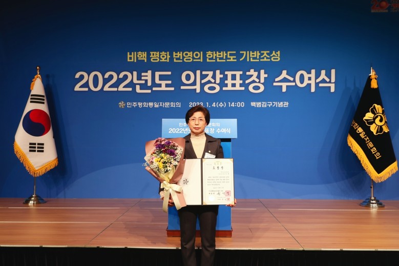 [부안군 세계타임즈 = 강옥선 기자] 부안군의회 김두례 의원이 지난 4일, 백범김구기념관에서 개최한 민주평화통일 자문회의 ‘2022 의장(대통령)표창 수여식’에서 의장표창을 수상했다.