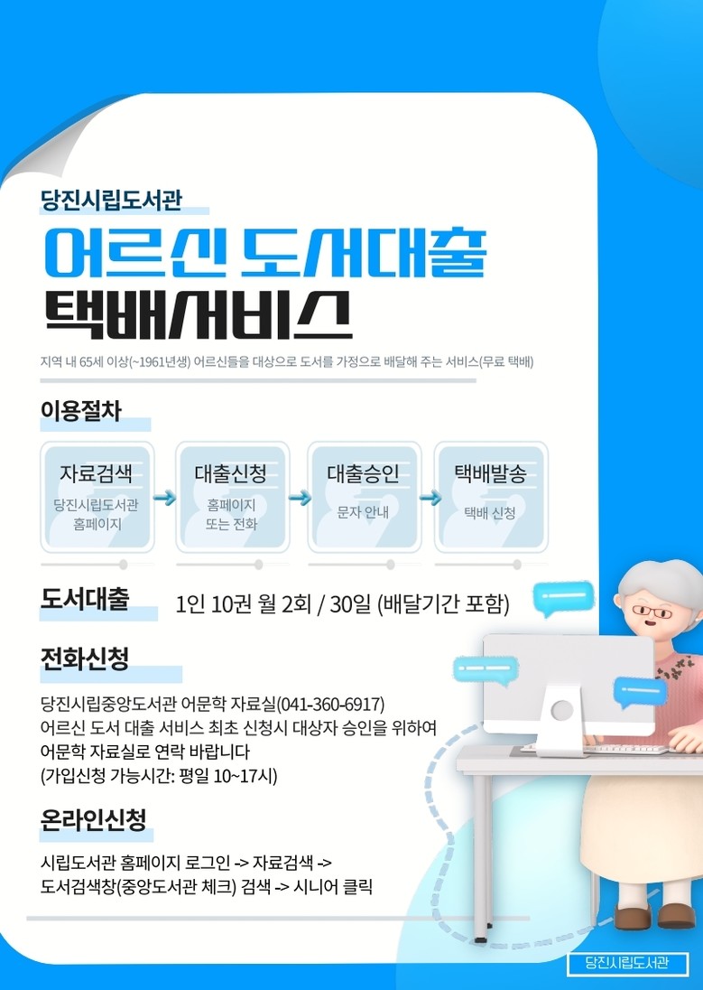‘어르신 도서 대출 택배 서비스’는 65세 이상 어르신을 대상으로, 도서관 누리집을 통한 온라인 신청은 물론 전화(☎041-360-6917)로도 간편하게 도서를 신청할 수 있어 고령층의 이용 편의를 높였다.