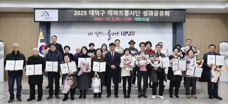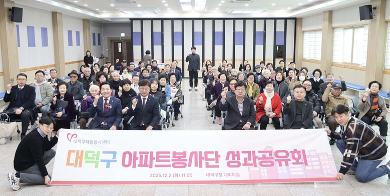 [대덕구 세계타임즈=이채봉 기자] 대전 대덕구(구청장 최충규)는 (사)대덕구자원봉사센터(이사장 박재용)가 2일 구청 대회의실에서 20개 아파트봉사단과 함께 ‘2025년 대덕구 아파트봉사단 성과공유회’를 개최했다고 밝혔다.