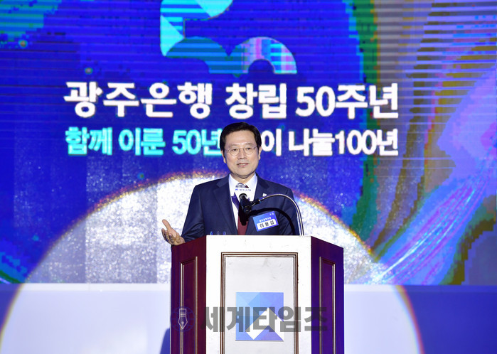 | ▲이용섭 광주광역시장이 19일 오후 서구 김대중 컨벤션센터에서 열린 '광주은행 창립 50주년 전야제 및 100년 은행 선포식'에 참석해 축사를 하고 있다./광주광역시 |