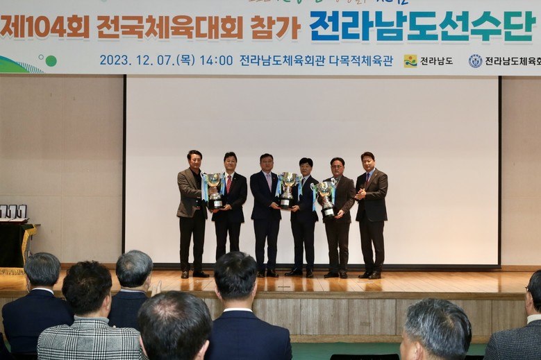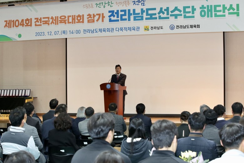 전남체육회 다목적체육관에서 열린 이날 행사는 제104회 전국체육대회에 참가한 전남 대표 선수단을 격려하고 전남 체육 발전에 기여한 관계자들의 노고를 치하하기 위해 마련됐다.