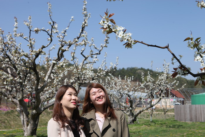 충북 영동군 과일나라테마공원의 봄햇살 가득담긴 배꽃이 순백의 우아한 자태를 뽐내며 상춘객들을 유혹하고 있다.