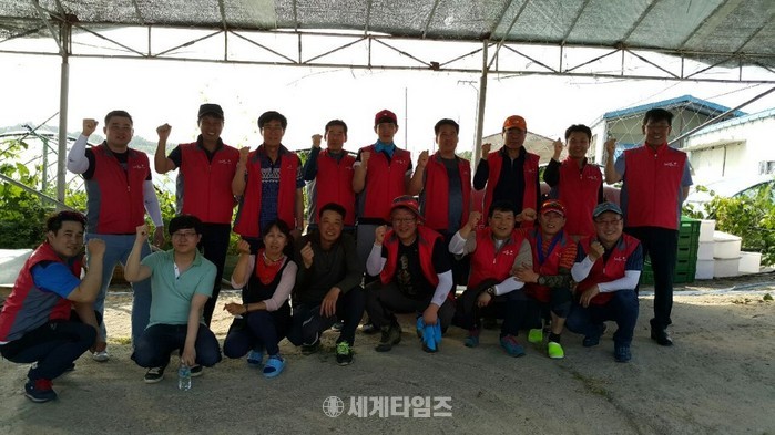 첫 번째 봉사활동은 지난 6월 22일(목), 경기도 안성시 서운면 포도농가에서 실시됐다. 임직원 40여명이 참여했으며, 이들은 폭염특보에도 아랑곳없이 정성들여 포도 알을 솎아냈다. 땀방울이 온종일 옷가지를 적셨지만 임직원들은 “키 큰 포도나무가 만들어준 그늘덕분에 생각보다 견딜만했다”며 미소를 보였다. 하늘도 감동한 듯 봉사활동이 끝난 24일(토)부터는 경기도 안성시 일대에 비가 내렸다. 폭염 속에서도 보름이상 비가 내리지 않아 시름하던 농민들에겐 희망과 같은 단비였다.