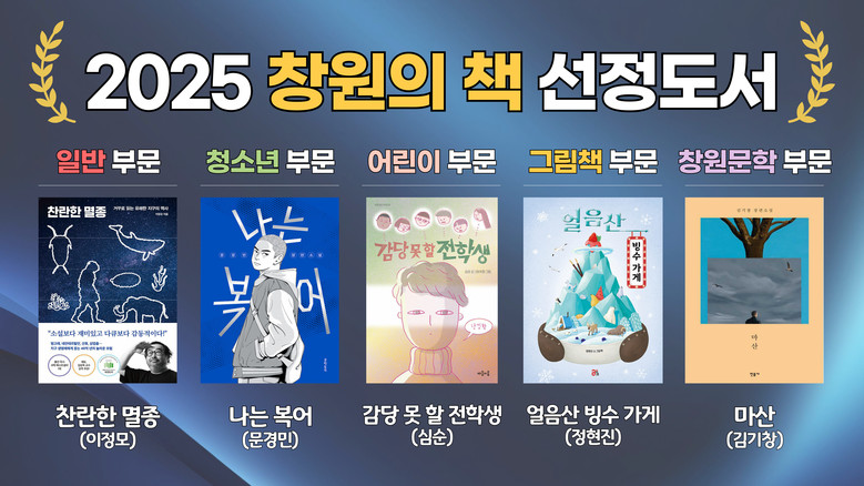 선정된 도서는 △ 일반 부문 : 찬란한 멸종(이정모/다산북스) △ 청소년 부문 : 나는 복어(문경민/문학동네) △ 어린이 부문 : 감당 못 할 전학생(심순/마음이음) △ 그림책 부문 : 얼음산 빙수 가게(정현진/올리) △ 창원문학 부문 : 마산(김기창/민음사)이다.