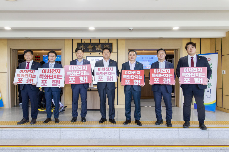 이날 손희권 의원이 발언하는 동안 김희수, 한창화, 박용선, 이칠구, 이동업, 연규식, 서석영, 김진엽 의원 등 포항시 도의원 8명은 특화단지 유치를 간곡히 염원하는 포항시민과 각고의 노력을 기울이고 있는 포항시의 염원을 담아 본회의장에서 피켓을 들고 힘을 실었다.