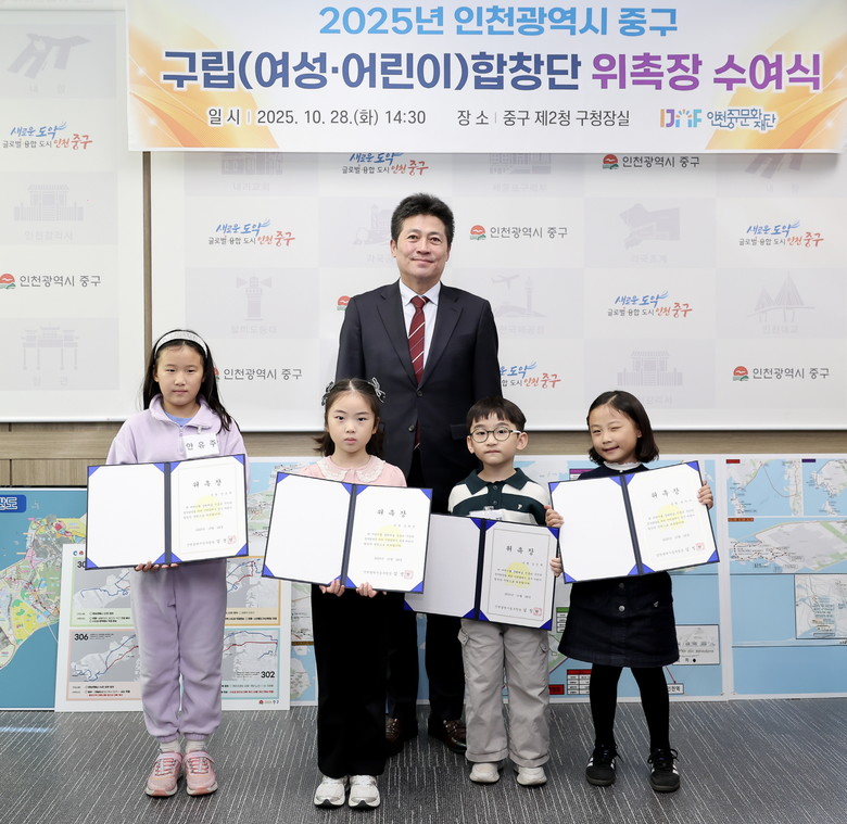 [중구 세계타임즈=심하린 기자] 인천시 중구(구청장 김정헌)는 지난 28일 제2청 구청장실에서 ‘구립합창단 신규 단원 위촉식’을 열고 새로운 단원들의 첫걸음을 축하했다.
