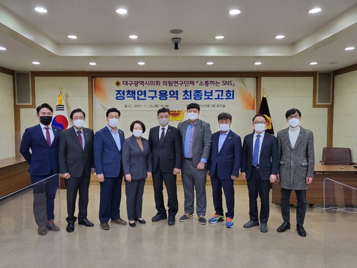 의원연구단체 『소통하는 SNS』의 대표인 이태손 의원(비례)은 “올해 초부터 『소통하는 SNS』소속 의원들이 추진해온 연구용역이 최종 결실을 맺는 의미있는 자리”라며, “용역결과물이 대구시민의 건강과 안전을 지켜줄 수 있는 소중한 자료로 쓰여질 수 있도록 정책 반영과 입법활동 등에 최선을 노력을 다하겠으며, 앞으로도 지속적인 연구활동을 통해 정책을 발굴하고 제도를 개선하는 등 시민들에게 사랑받는 의회가 될 수 있도록 노력하겠다”라고 말했다.