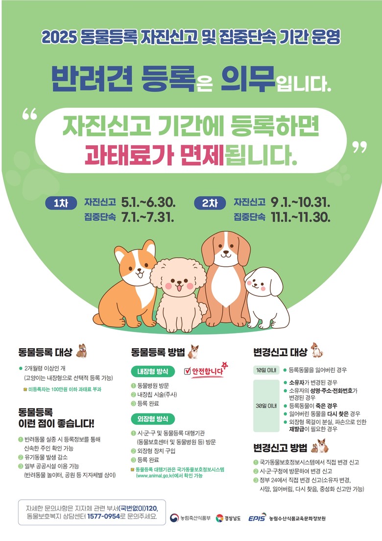 경남도는 6월 30일까지 자진신고 기간을 운영한 뒤, 9~10월에도 2차 자진신고 기간을 운영해 동물등록을 활성화할 계획이라고 밝혔다.