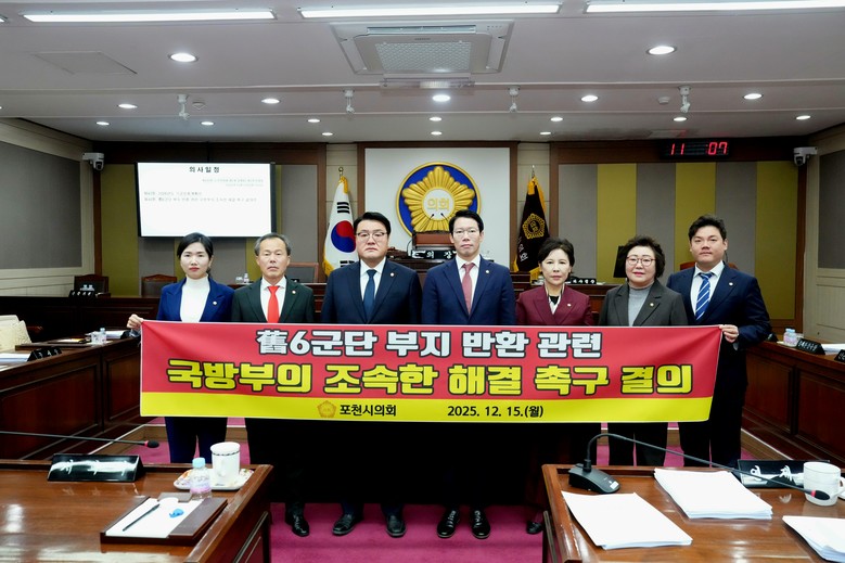 특히 이날 연제창 의원 등 7명이 발의한 ‘舊6군단 부지 반환 관련 국방부의 조속한 해결 촉구 결의안’을 채택했다. 시의회는 결의문을 통해 ▲국방부가 수십 년간 무상 사용해 온 시유지를 원상복구 후 즉각 반환할 것 ▲징발 전 원소유주에게 토지를 반환할 것 ▲반환 지연 및 비용 전가에 대해 포천시민에게 사과할 것을 강력히 촉구했다.